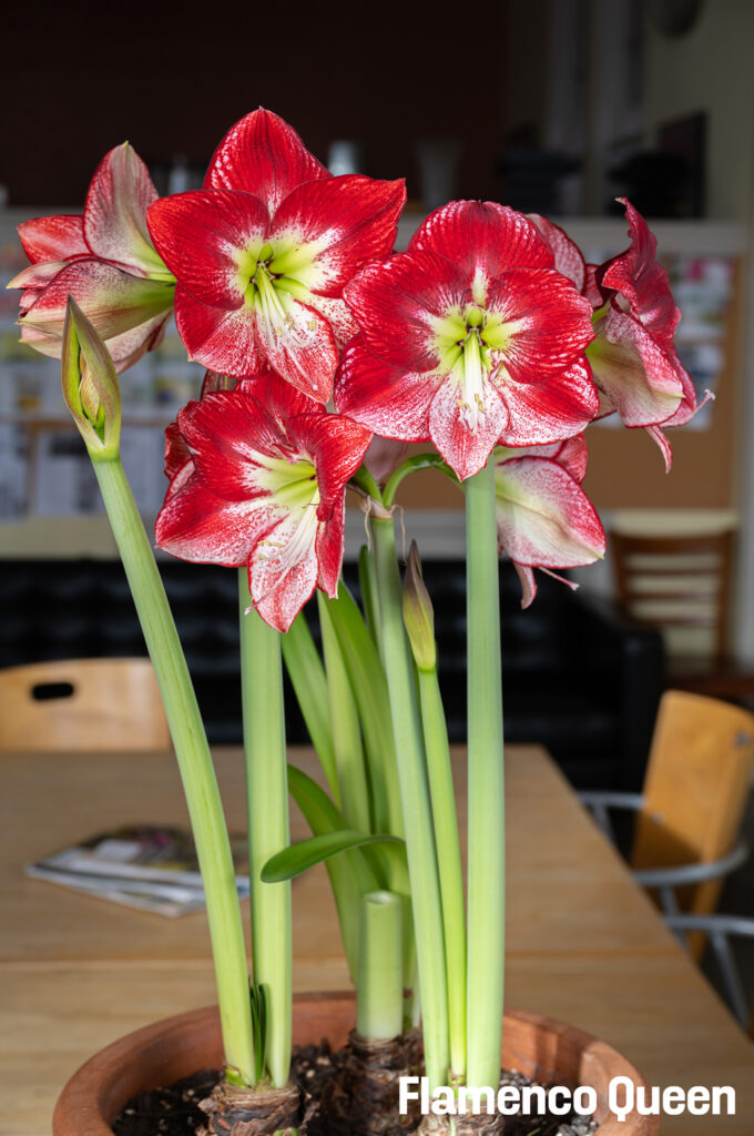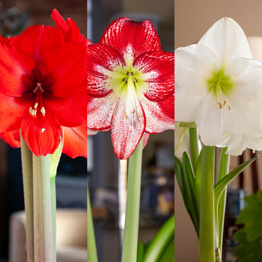 Today’s amaryllises are descended from wild plants that grew (and still grow) wild in Central and South America. So it’s no surprise to learn that amaryllis bulbs are grown commercially in Peru. This is a sampler of three single-flowered varieties from south of the equator. One bulb each of Red Victory, Flamenco Queen, and White Candle. Each bulb labeled. Introduced 2023.